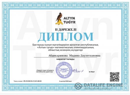 Республикалық "Алтын тұғыр" математикалық конкурсының облыстық кезеңінен 2-орын Бастауыш мұғалімі- Абдикаримова Мадина Даулетхановна